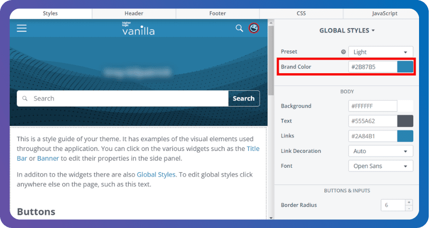 Ensure that your color palette is applied consistently across your community and all communication materials. Vanilla’s global styling guide simplifies this by letting you set a single brand color that’s automatically applied to multiple elements, like background, text, and links, ensuring a cohesive look without added effort. But if you want more control, you can get as granular as you need. Whether you prefer to keep it simple or customize each element, Vanilla offers the flexibility to manage your community’s branding to fit your vision.