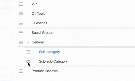 As your community grows, pay attention to discussion topics. When a topic seems to command sustained attention, consider giving it its own category. As the conversations continue to develop, you may want to subdivide categories. Vanilla lets you nest sub-categories several levels deep. The process is simple: just go to the category management page on your dashboard, click, and drag (see below)